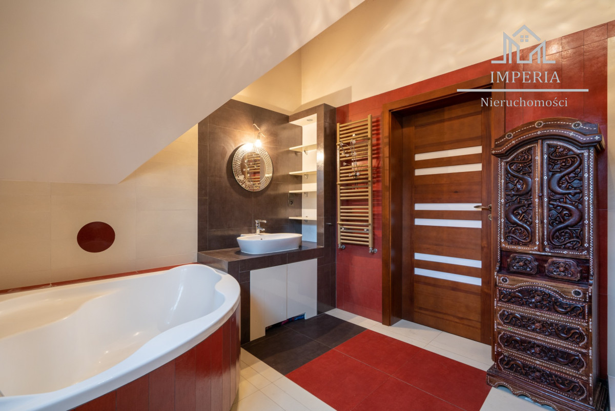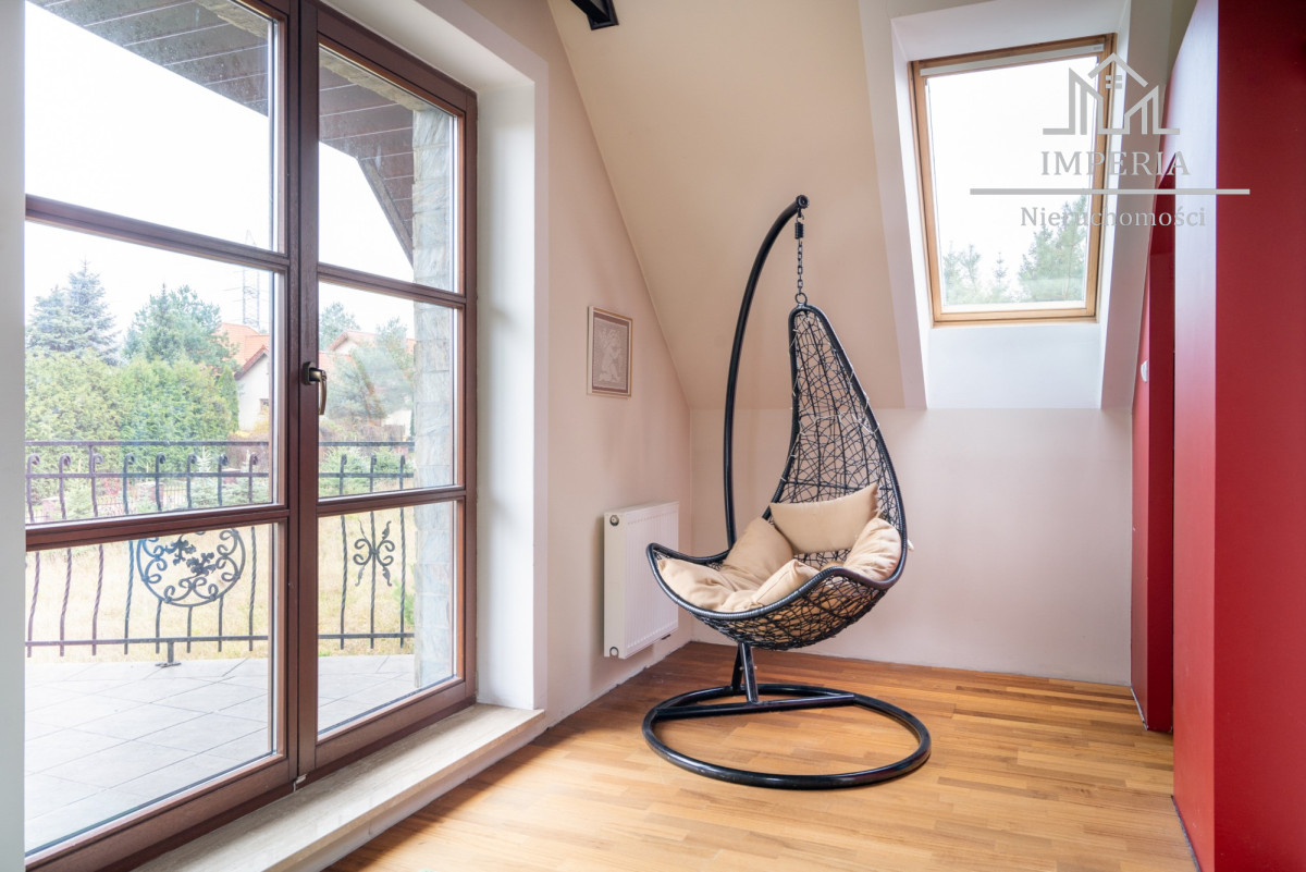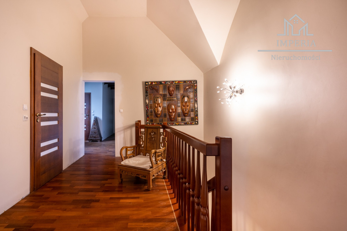 Po drewnianych bukowych schodach dostaniemy się na piętro, gdzie znajdują się 4 sypialnie ( 1 z wyjściem na duży balkon), 2 łazienki z wanną i prysznicem (ogrzewanie podłogowe) oraz pokój o charakterze magazynowym.