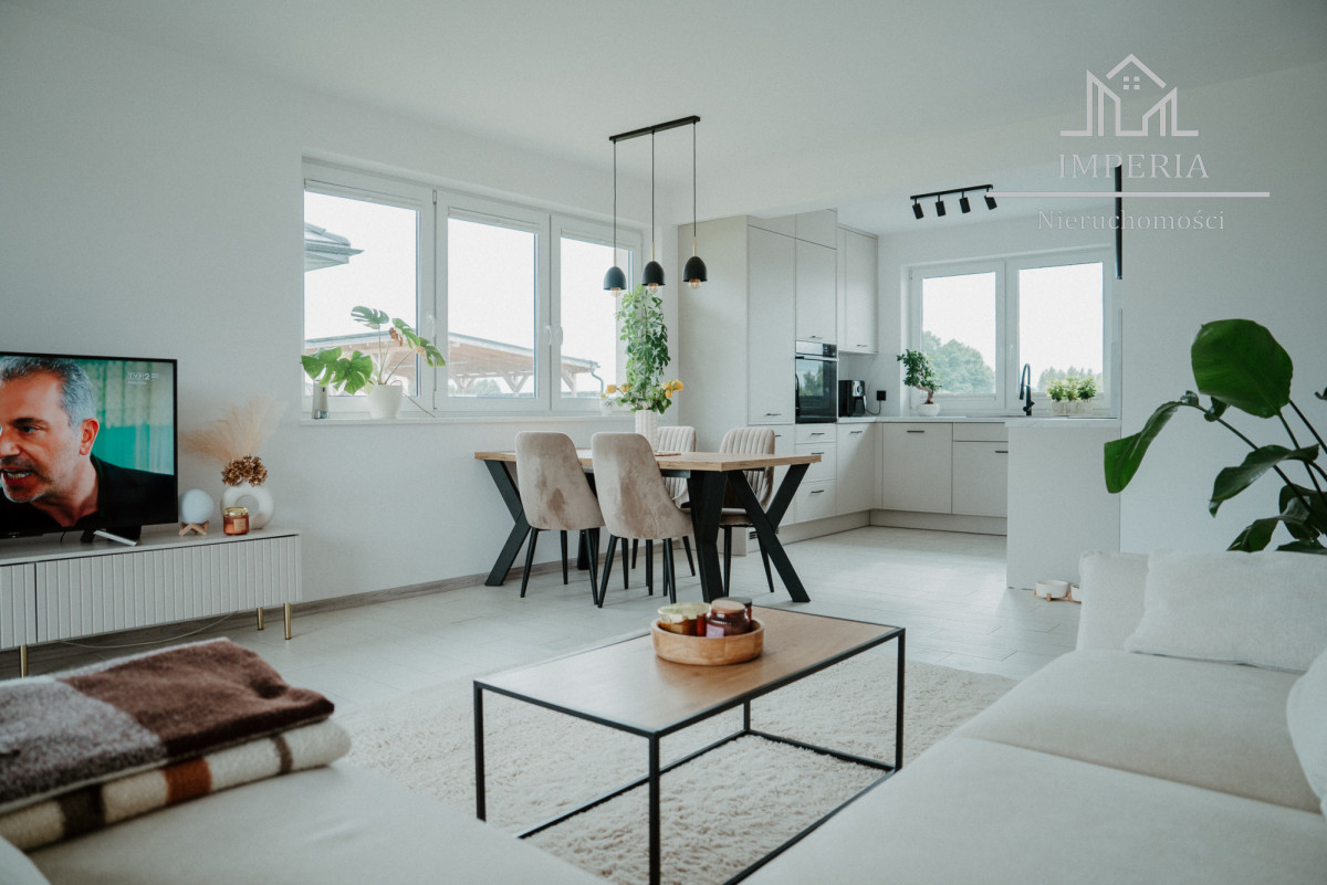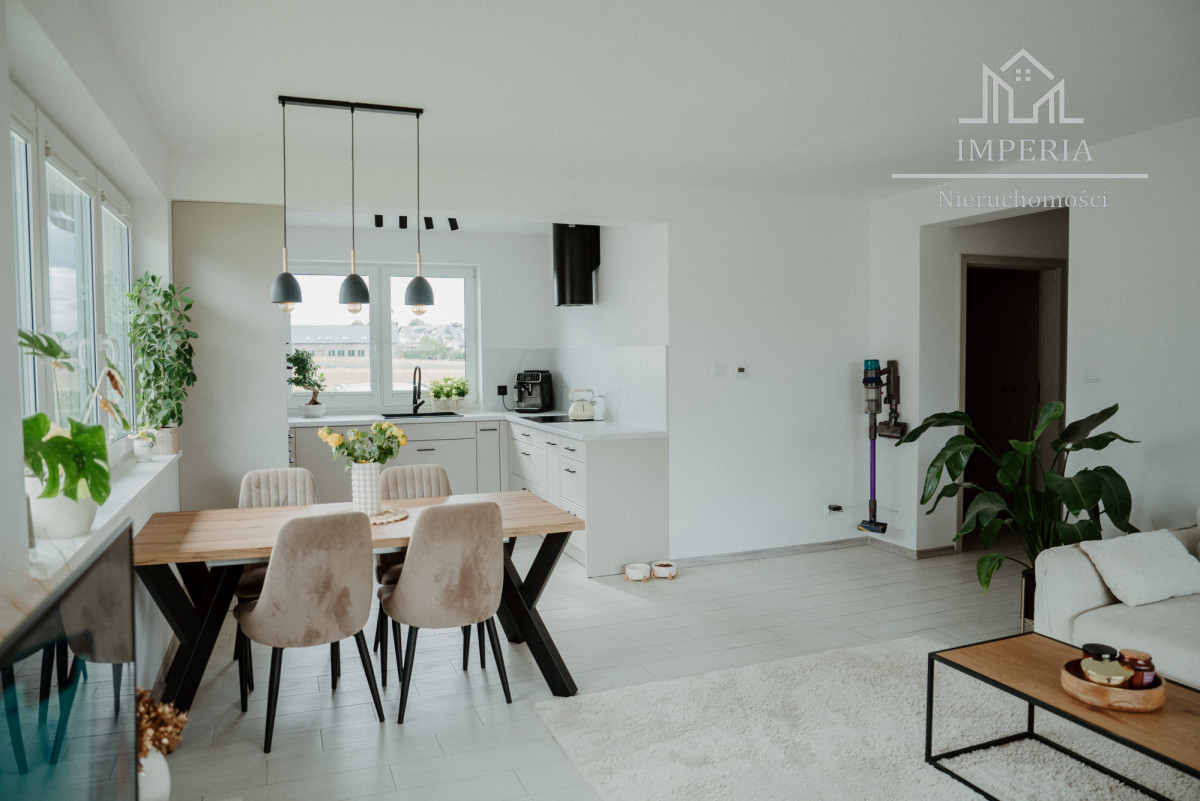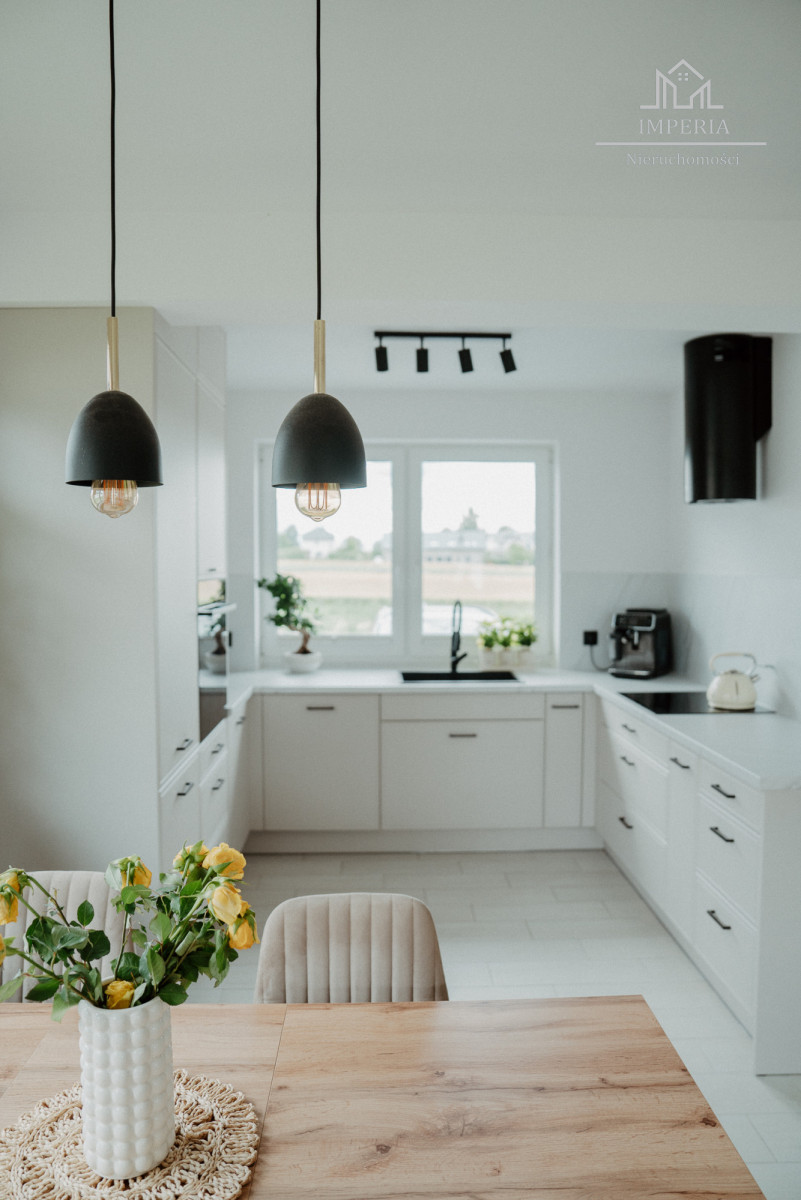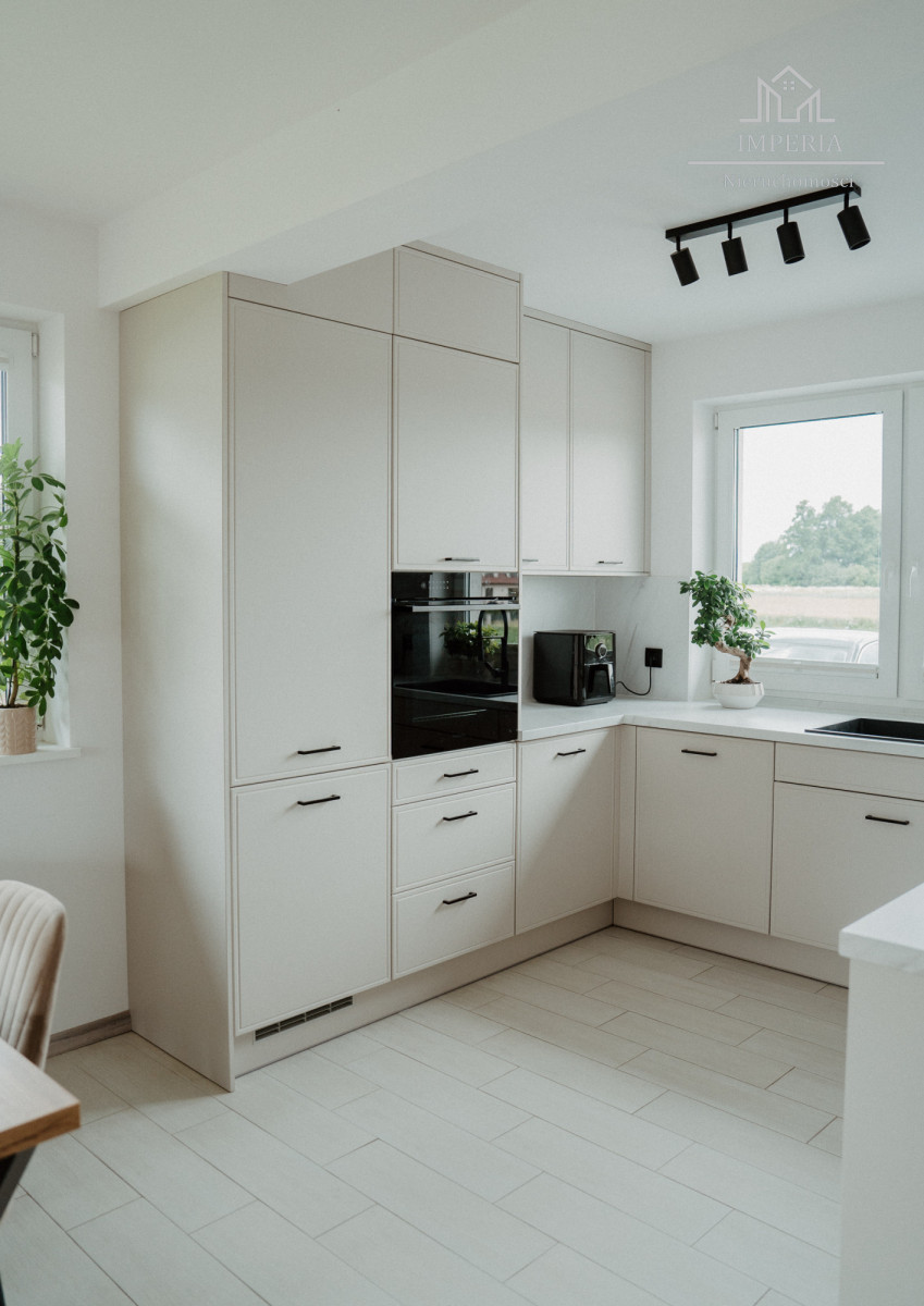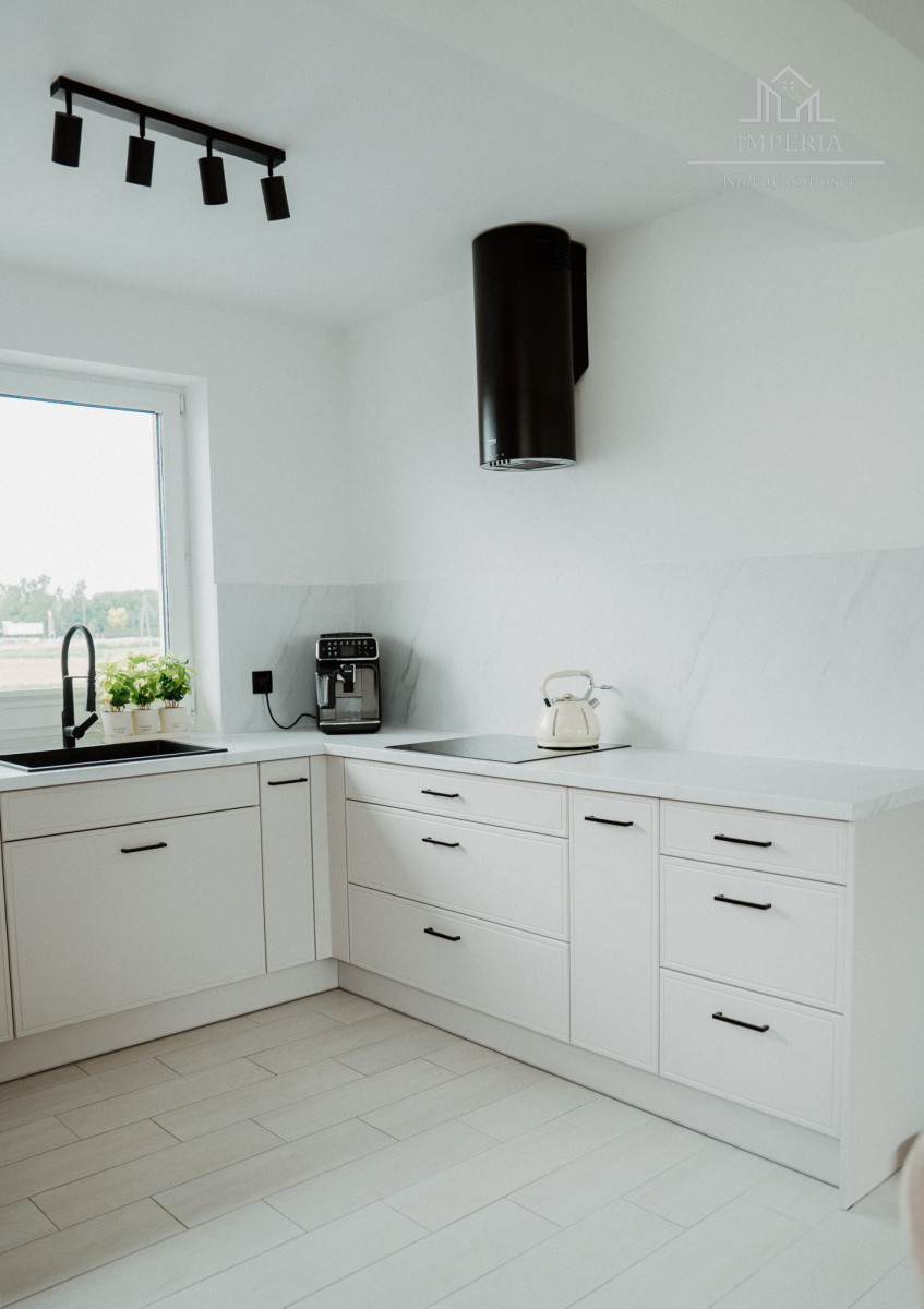 - Otwarta kuchnia z dużym oknem (ponad 7 m²), wyposażona w piekarnik, płytę indukcyjną, lodówkę, zmywarkę i okap