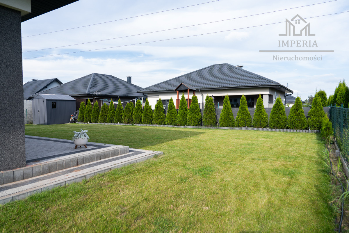Dom znajduje się na ogrodzonej działce o powierzchni 506 m². Przed budynkiem zaaranżowano wygodny podjazd mieszczący dwa auta. Ogród jest zadbany, z równo przystrzyżonym trawnikiem oraz praktycznym domkiem narzędziowym. Z salonu wychodzimy bezpośrednio na przestronny taras, który stanowi idealne miejsce do relaksu i spędzania czasu z rodziną.