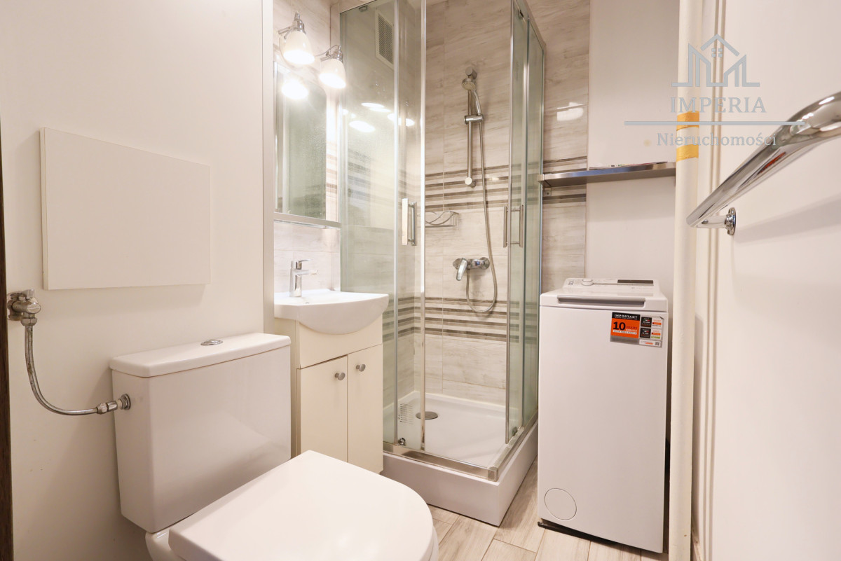 - Łazienka z WC, wyposażona w prysznic oraz nową pralkę